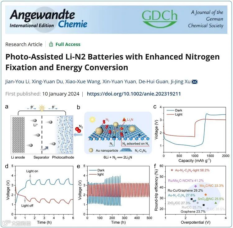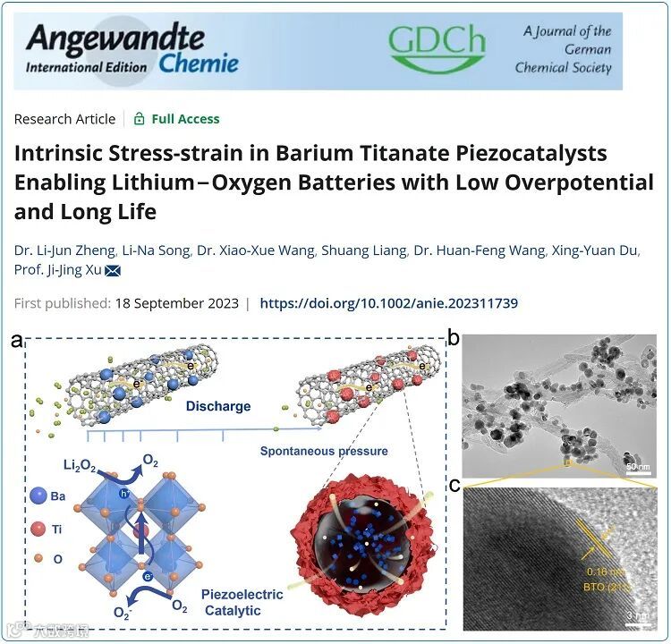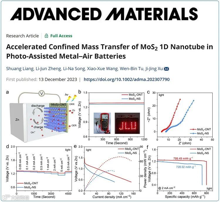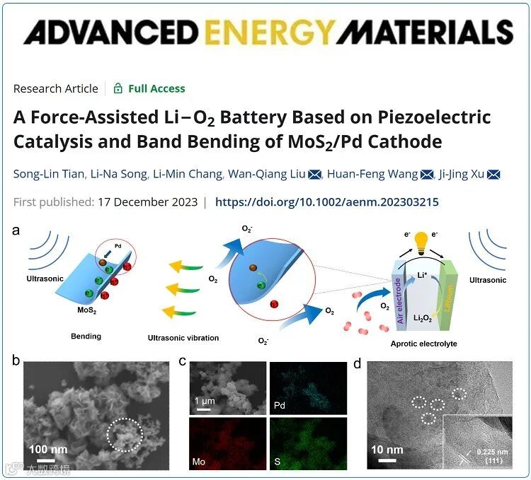 利用绿色可再生太阳能改善锂−氧气电池中氧还原和氧析出反应动力学被认为是有前景的选择。在该电池体系中,正极上产生的光生电子和空穴可分别增强充放电反应中放电产物的生成和分解动力学,有效降低电池的过电位。然而,光正极中光电子和空穴的快速复合仍然是光辅助锂−氧气电池面临的关键难题,限制了其进一步发展。因此,开发其他非接触、环境友好的外场辅助策略提升正极反应动力学是十分必要的,且具有很大的挑战。基于此,该工作制备了MoS2/Pd纳米复合材料用作空气正极压电催化剂,构筑了力场辅助锂−氧气电池新体系。在超声激活下,压电催化剂中形成压电极化和内置电场,导致电子和空穴连续分离,提高了氧还原和氧析出反应动力学。此外,Pd的引入促进了电子的转移,进一步抑制了电子-空穴对的复合,从而增强了放电产物分解/生成的催化活性,降低了放电/充电过电位。基于MoS2/Pd力场辅助锂−氧气电池展示出2.86 V的超低充电平台和2.77 V的高放电平台。同时,该工作也证明了所提出的力辅助策略可以通过有效地还原和分解CO2和CO32-而应用于锂−二氧化碳电池系统,体现了力辅助策略在金属−空气电池中的普适性。该工作所提出的力场辅助策略为实现金属-空气电池的高效能量转换提供了重要的见解。该工作发表在国际权威期刊Adv. Energy Mater.上,长春理工大学博士生田松林为为论文第一作者,徐吉静教授为共同通讯作者(Adv. Energy Mater. 2024, 14, 2303215)。