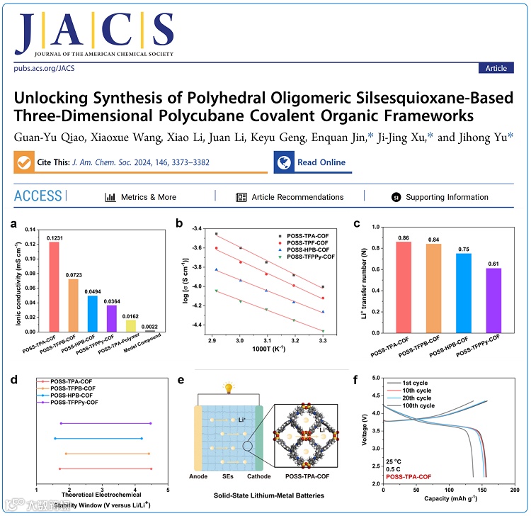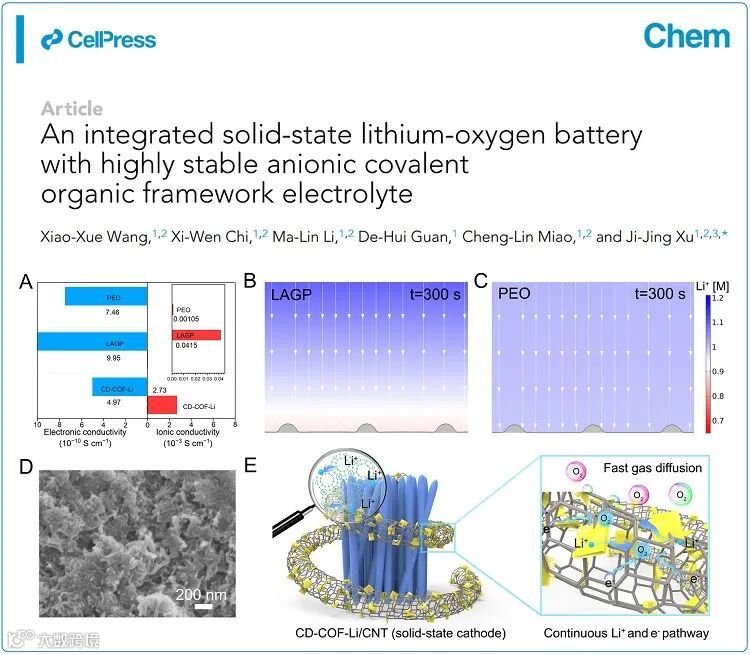 固态锂电池由于具有较好的安全性和高能量密度而受到广泛关注,尤其是在现有的电池体系中具有最高理论能量密度的固态锂−氧气电池,有望在下一代储能设备中发挥重要作用。但是,高性能固态电解质材料的缺乏、高催化活性固态正极的设计复杂性以及固态电解质\电极界面构筑困难限制了其快速发展。因此,为固态锂−氧气电池寻求一种同时具有高离子电导率、高界面相容性和高化学稳定性的新型固态电解质至关重要。基于此,该工作开发了一种用于构筑高安全固态锂−氧气电池和固态锂金属电池的新型三维共价有机框架(COF)固态电解质材料,并揭示了锂离子在材料骨架中的输运机制。该COF固态电解质由于丰富的离子传输通道、独特的骨架柔性和较小的界面传输阻抗,展现出高达2.7 × 10−3 S cm−1的离子传导率、0.18 eV的低活化能和优异的电化学稳定性。利用COF的骨架柔性,成功构建了具有电子、离子连续传输通道的正极材料。得益于电解质和电极低阻抗传输界面,使用COF电解质组装的固态锂−氧气电池展现出9340 mAh g−1的高比容量和100次的长循环寿命,远优于基于商用的PEO和LAGP固态电解质的固态锂−氧气电池(38次和50次)。同时,COF电解质组装的固态锂金属电池也展现出优异的倍率性能和循环性能,在2 C的电流密度下,放电比容量依然可以达到125.1 mAh g−1。该工作展示了COFs作为新型锂离子导体在下一代固态储能器件中巨大的应用潜力,为未来固态电解质材料设计和固态电池技术发展提供了新思路。该工作发表在国际权威期刊Chem 上,吉林大学鼎新学者王晓雪博士为论文第一作者,徐吉静教授为通讯作者(Chem2023, 9, 394–410)。
