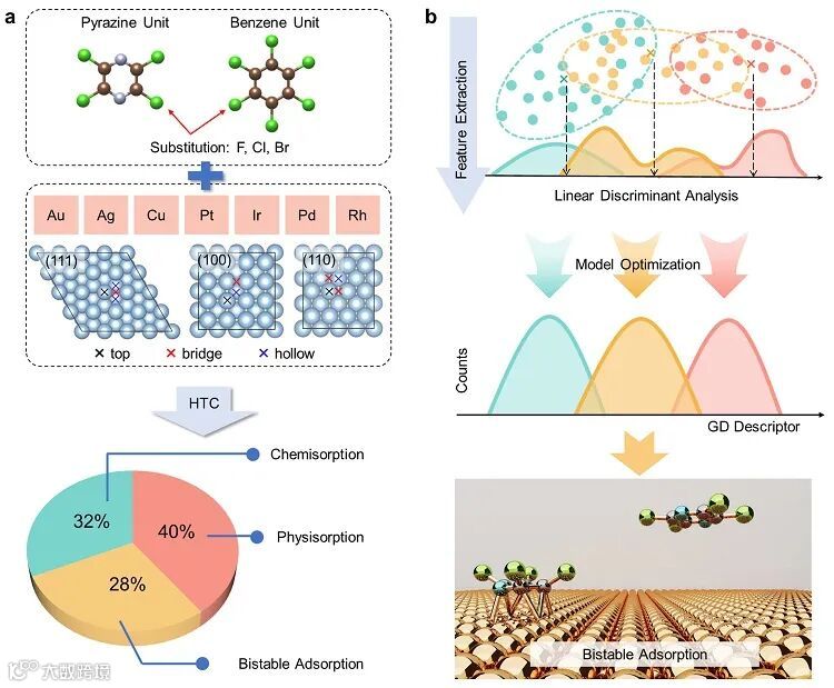 图1. 吸附状态描述符构建过程的示意图。(a) 苯衍生物分子在不同金属表面上的高通量DFT计算。(b) 从吸附数据集中提取物理特征和构造描述符。