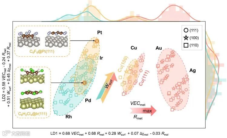 )。对LDA降维后的结果进行分析,能够得出:(1)表面功函数,对于{Pd、Pt、Ir、Rh}这一类体系,功函数越大,越倾向于出现双稳态吸附;(2)价电子浓度