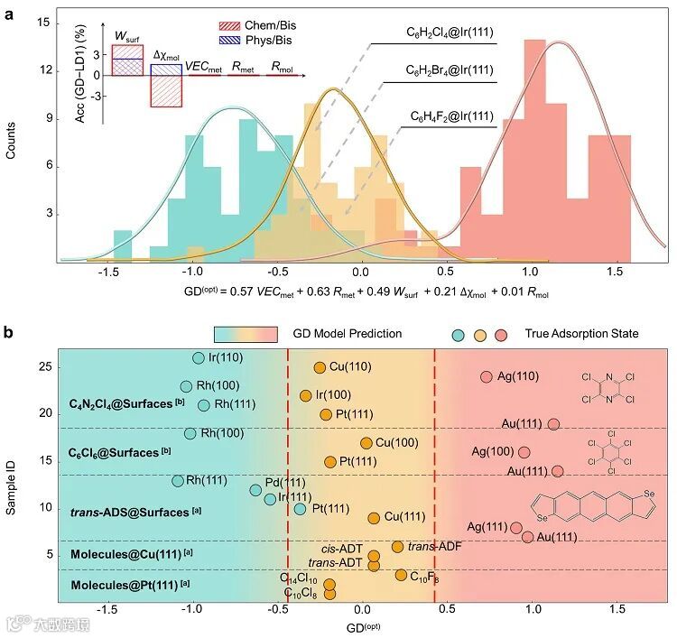 优化后的GD模型呈现高的准确性。在训练样本上,三种类别吸附状态的样本均呈现出类似于正态分布,区分程度高(图5a)。同时,研究者使用了外部数据进行验证(包含实验数据和计算数据),图5b中数据点颜色为测试体系的真实吸附状态,背景色为模型预测结果,可以看到GD模型对测试样本能够有较好的区分,准确率达到90%。