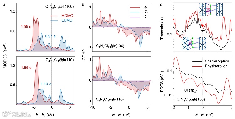 @Ir(110)吸附体系来研究界面轨道杂化和吸附类型分子开关的电子性质(图6a、6b)。通过对