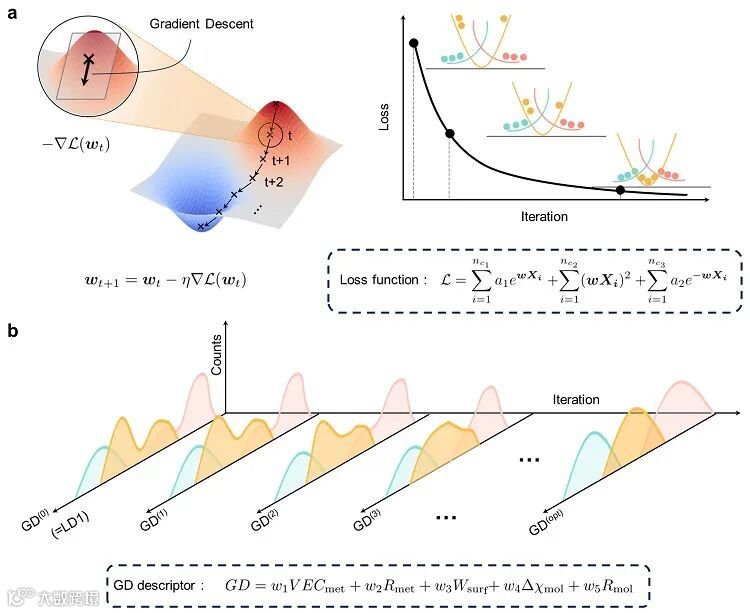 图4. (a) 梯度下降模型(GD)的示意图。(b) 吸附体系的分布随着GD描述符变化示意图。