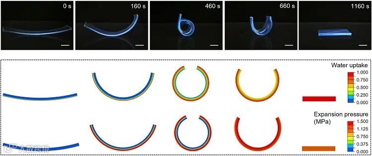 图2. 刺激响应水凝胶的变形过程以及模拟结果。图片来源: