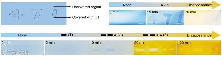 刺激响应水凝胶在偏振光下具有双折射现象,这能够赋予其双重信息加密的功能。利用硅油作为加密墨水,可以调节水的蒸发实现信息传递(图4)。硅油覆盖区域可以阻止水的蒸发,从而与未覆盖区域之间形成应力分布的差异。虽然在自然光下无法察觉,但这种应力模式导致双折射颜色变化,实现了时间依赖性的信息传递和加密。例如,用硅油墨水在拉伸的水凝胶上书写“471”,数字信息经历应力诱导的演变,在偏振光下先出现然后消失。进一步地,不同粘度的墨水组合使得更复杂的次序性信息传递和加密成为可能。利用粘度不同的墨水(100、1000和3500 CPS)在水凝胶上书写“▬ ▬ ● ●”,可在2、10、50分钟时分别传递“T”、“G”、“Z”等字母信息。这种时间依赖性的加密信息的叠加可以实现更加复杂的双重信息加密效果。