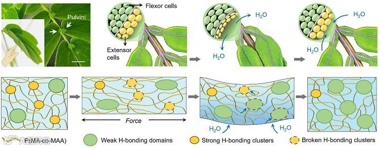 差异化氢键网络交联的水凝胶,成功地仿效了含羞草叶柄中伸肌细胞和屈肌细胞的协同作用机制,实现了多模态、多路径的应激响应行为。