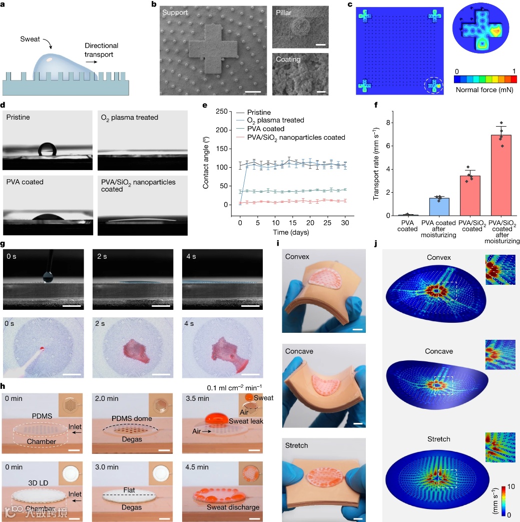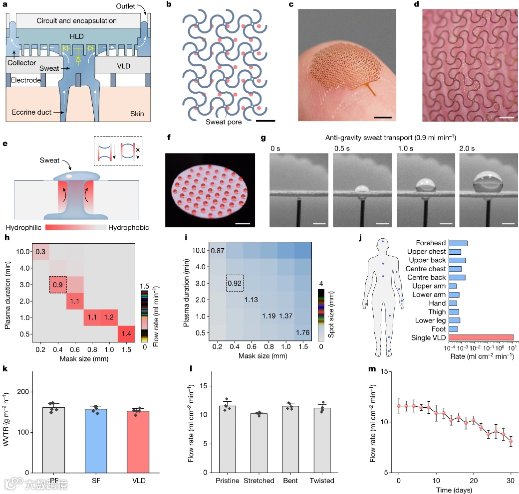 该设备仿佛具有“二极管”单向导通的性质,垂直层负责单向吸收汗液并防止回流,水平层则负责定向传输汗液,最大排汗速率比人体运动时的出汗速率高出4000倍。该结构能够直接与可穿戴电子产品集成,具有强大的粘附力,保证器件用于生物信号监测时能够稳定工作,不受体表出汗的影响。