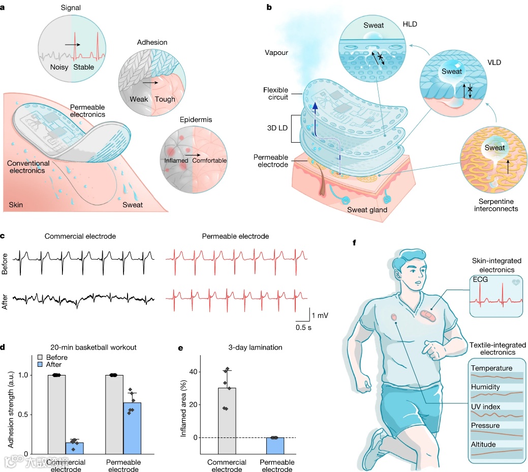 然而,目前可穿戴器件中刚性的电子元件、渗透率低的包装材料等因素,都会影响器件的透气性,使得汗水不能快速、充分地从皮肤排出。想一想夏天室外带着智能手表跑步的感觉,不仅会让佩戴者不舒服,还会降低器件获得的信号