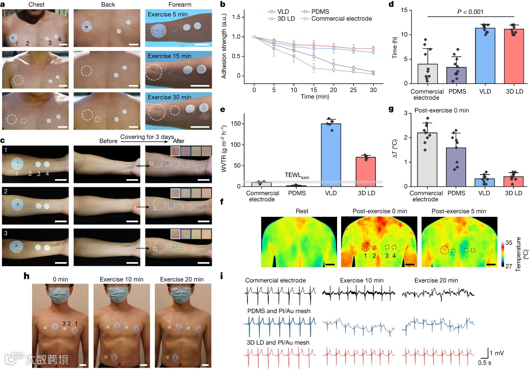 随后,研究者将商业心电图(ECG)贴片与3D LD集成,进行可穿戴测试。组装方式非常简单,只需将贴片粘贴在3D LD表面即可。测试30分钟,商业ECG和PDMS贴片均从测试者皮肤上脱落,而3D LD贴片则紧密贴合在测试者身体上,即使连续佩戴3天,皮肤也没有红斑现象。