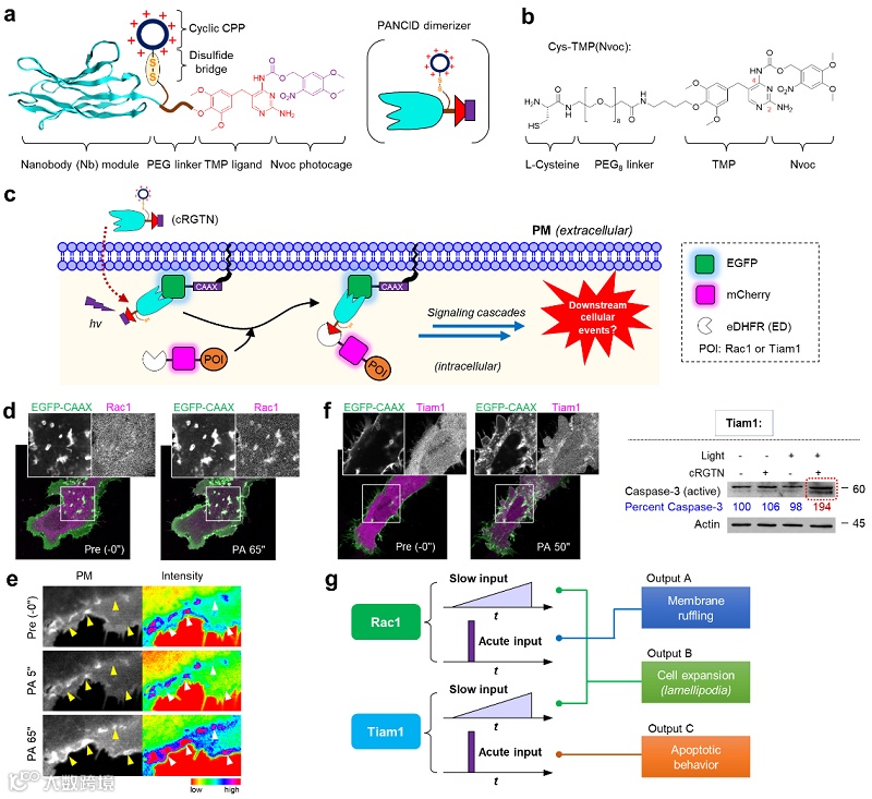 图3. 基于LC3B的ANTC的设计与应用。a)基于LC3B的ATNC的工作机制示意图。b)共聚焦显微镜和WB 结果显示ATNC有效降解EGFP。c)ATNC具有模块化特征,更换纳米抗体模块即可降解不同靶标。d)双纳米抗体型ATNC实现Tiam1和RhoA之双靶标同时降解。