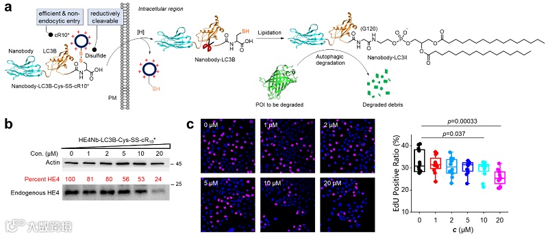 人附睾蛋白4(HE4)是近年来越来越受到关注的卵巢癌标志物,它是一种糖蛋白,也是不可成药靶标。为此,该研究工作开发出了自噬抗体phagobody通过加药降解内源的HE4,成功抑制了卵巢癌细胞的增殖和迁移,显示出ATNC技术在转化应用层面的潜力。该研究相关成果发表在化学权威杂志Journal of the American Chemical Society 上,并被遴选为封面文章,相应技术也已申请了中国发明专利。