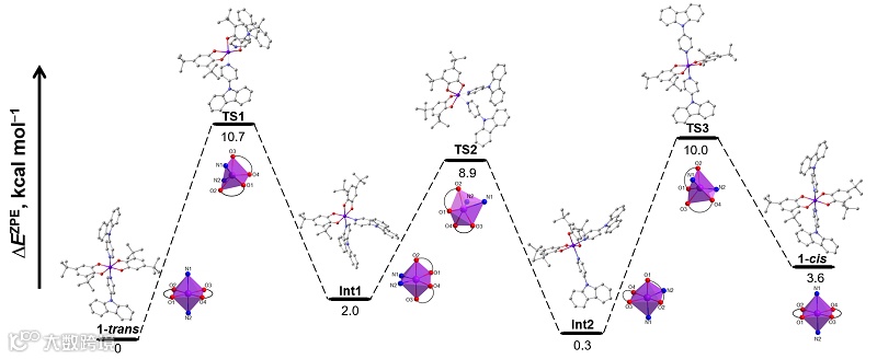 作者对异构化机制进行了探索,1-trans(HS-CoII)c和1-cis(HS-CoII)c的归一化咬合b值落在有利于扭转机制的范围内 (分别为1.32和1.30)。DFT计算表明1-trans和1-cis之间能量差很小,是热可及的。同时,相比于高能垒的断键机制,异构化更倾向于1-trans经历了三个连续的Rây–Dutt 扭转,最终转变为1-cis。因此,作者认为异构化转变是通过非键断裂扭转机制发生,其过程在热力学上是有利的,转化主要涉及熔融介导的异构化,然后是重结晶,异构化反应倾向于从低熔点异构体转变到高熔点异构。