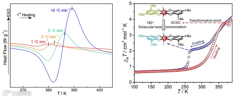 图2. DSC traces of 1-trans in the first heating process at heating rates of 1, 2, 5 and 10 ℃ min-1(左)。在固态中实现了热激活分子扭转诱导trans-to-cis结构转变,价态异构一步到两步转变(右)。