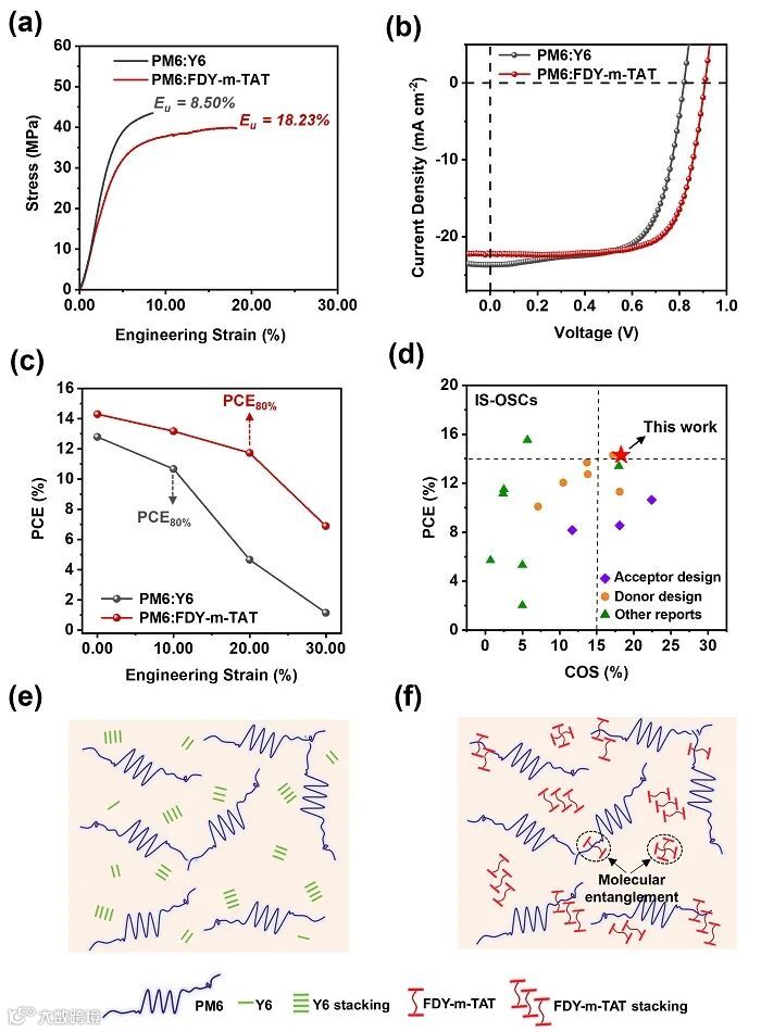 作者进一步系统研究齐聚物受体FDY-m-TAT的机械拉伸性能,同时选用小分子受体Y6作为对照材料。伪自由拉伸测试实验结果证明,相比于共混膜PM6:Y6,共混膜PM6:FDY-m-TAT具有更高的拉伸性和韧性。主要表现为:薄膜的开裂应变从8.50%(PM6:Y6)提升到18.23%(PM6:FDY-m-TAT),韧性从2.55 MJ m–3(PM6:Y6)提升到6.02 MJ m–3(PM6:FDY-m-TAT)。此外,作者制备了本征可拉伸有机太阳能电池器件,基于PM6:FDY-m-TAT的IS-OSCs的初始PCE为14.29%,明显优于PM6: Y6的IS-OSCs(12.80%)。对器件进行拉伸测试实验,发现基于PM6:FDY-m-TAT的IS-OSCs在保持80%的初始PCE时的拉伸应变为20%,而基于PM6: Y6的IS-OSCs仅为10%。