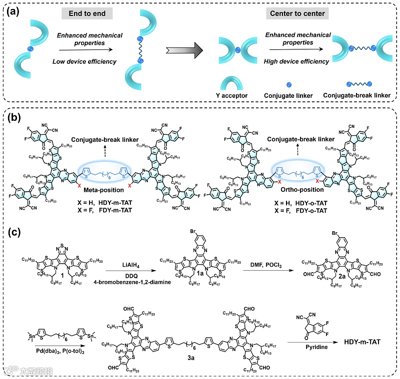 虽然使用非共轭连接能够改善齐聚物受体的机械拉伸性能,但是非共轭连接会破坏分子骨架平面性和堆积有序性,因此这类受体材料通常表现出较低的器件效率。不同于常规的"端基-端基"连接方式,本研究选择采用新型的"中心-中心"连接方式。简而言之,以噻吩-烷基-噻吩作为非共轭单元,通过改变连接位点和卤素取代,成功合成了四种齐聚物受体,包括HDY-m-TAT、 FDY-m-TAT、HDY-o-TAT和 FDY-o-TAT。