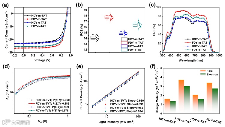 为了研究连接位点和卤素取代对受体材料的结构和性能的影响,作者将这四种齐聚物受体分别与聚合物给体PM6共混,进而制备刚性太阳能电池器件。结果发现,PM6:FDY-m-TAT和PM6:FDY-o-TAT的器件效率分别为18.07%和16.91%,明显高于PM6:HDY-m-TAT (14.42%)和PM6:HDY-o-TAT (15.23%)。这是因为引入氟原子提高了分子骨架平面性和堆积有序性,进而产生更高的载流子迁移率,器件上表现为更高的短路电流密度和填充因子。值得注意的是,18%的效率是已报道的具有非共轭连接的受体材料中的最高值之一。