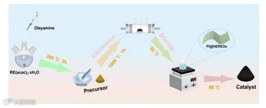 图1. 稀土高熵氧化物负载铂纳米颗粒的合成路径。
