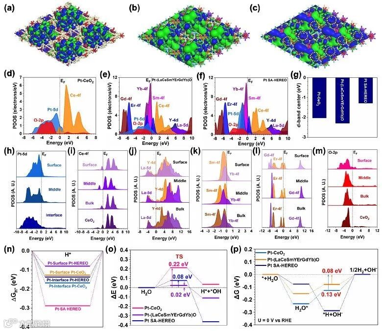 图6. 稀土高熵氧化物负载铂纳米颗粒的理论计算解析。