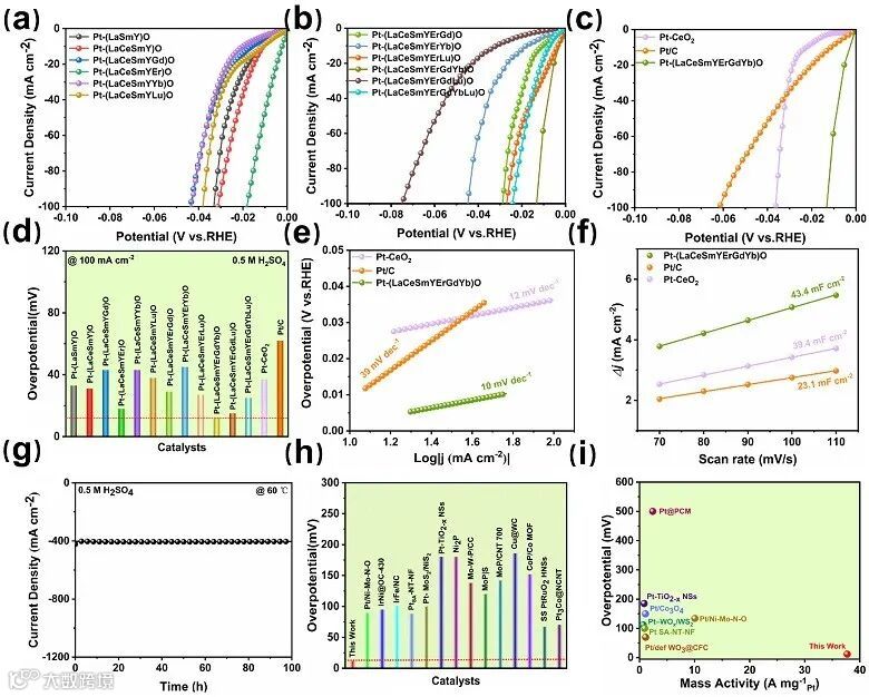 图4. 稀土高熵氧化物负载铂纳米颗粒在酸性环境下的析氢性能表征。