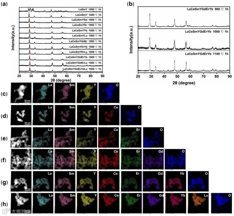 图2. 一系列合成的稀土高熵氧化物的XRD表征与EDX表征。