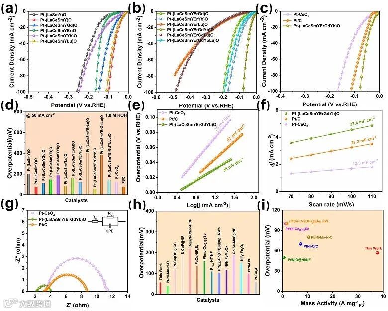 图5. 稀土高熵氧化物负载铂纳米颗粒在碱性环境下的析氢性能表征。