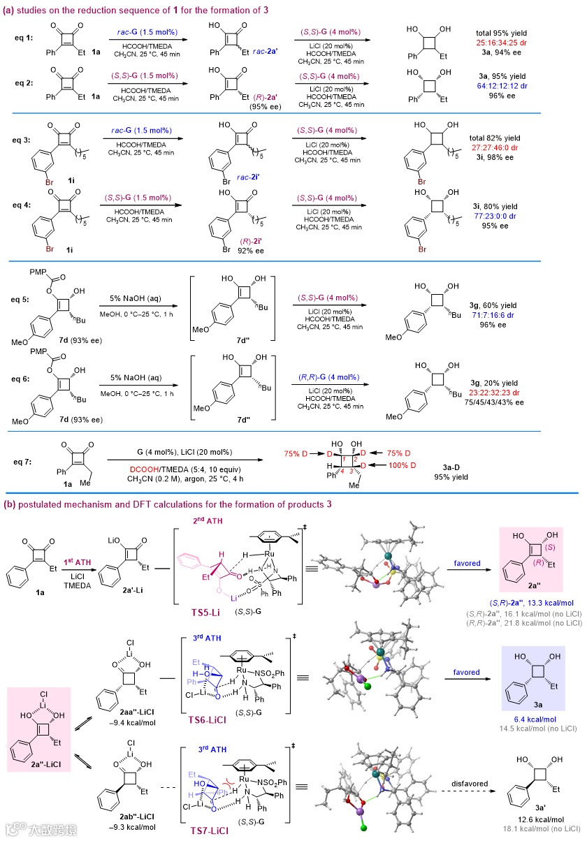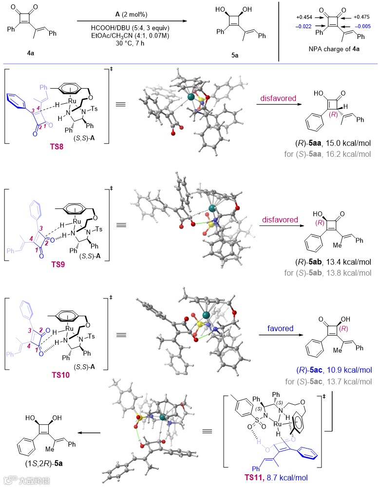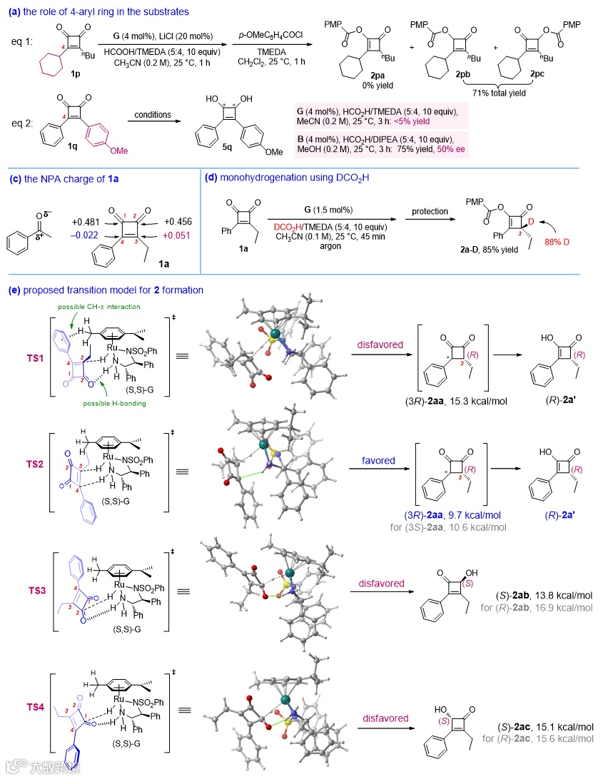 计算表明芳基烷基取代的环丁烯二酮的双键是极化的,从而有利于不对称转移氢化的发生(图7c)。氘带实验表明第一步确实是共轭加成(图7d)。过渡态模型计算发现,TS2是
