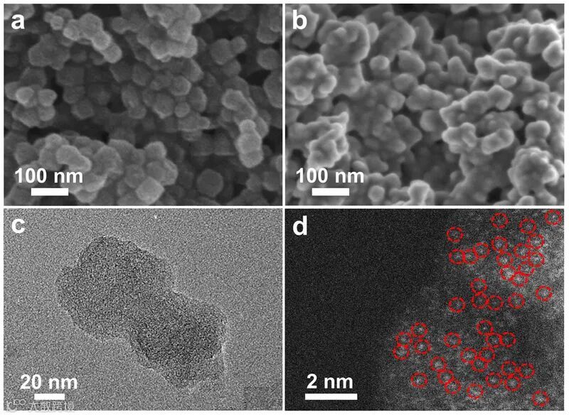 -N-C材料继承了Ni-ZIF-8的形貌,并且没有明显的金属纳米颗粒存在(图2a-2c)。从球差电镜可以观测到大量的单原子存在于碳载体上(图2d)。