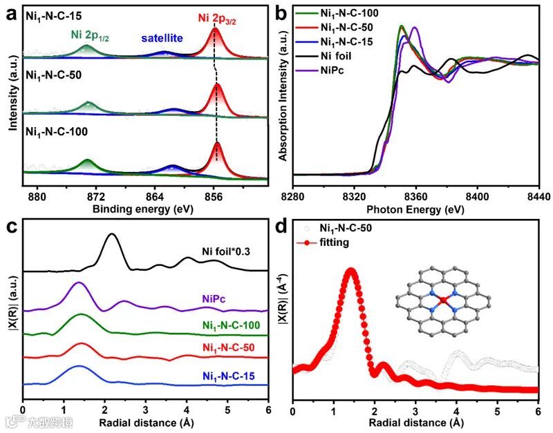 -N-C-100的Ni 2P XPS表征。b)Ni的K-edge XANES光谱。c)