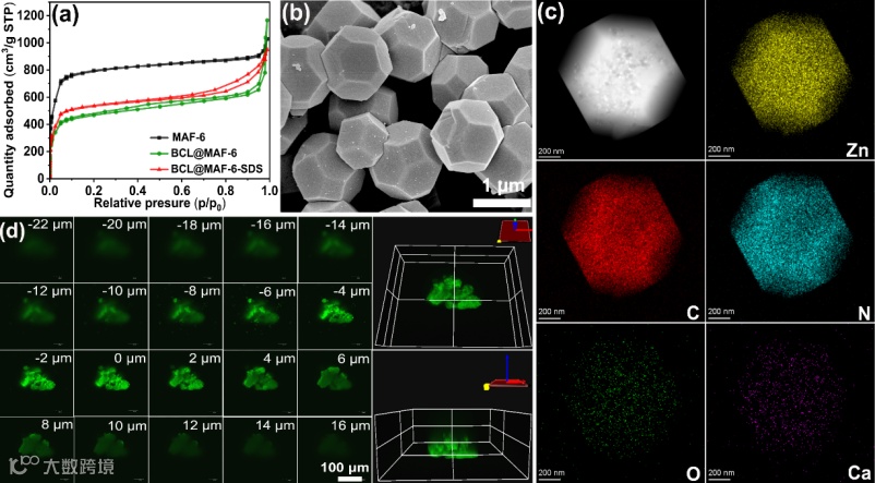 图2. (a) MAF-6, BCL@MAF-6和BCL@MAF-6-SDS的氮气吸脱附曲线图。(b) BCL@MAF-6的SEM图。(c) BCL@MAF-6中Zn, C, N, O和Ca的EDS元素分析图。(d) FITC标记的BCL@MAF-6-SDS的CLSM图。