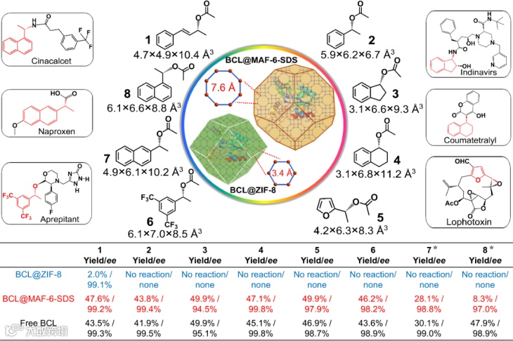 不对称催化是现代制药工业中不可或缺的环节,在药物研发和生产的各个阶段,手性靶分子的对映选择性合成是最至关重要的一步。利用MAF-6的孔径大于ZIF-8的优势,BCL@MAF-6-SDS催化剂在有机合成手性药物体驱分子中能够让酶分子接触到更大的有机底物,从而展现出了前所未有的催化活性。