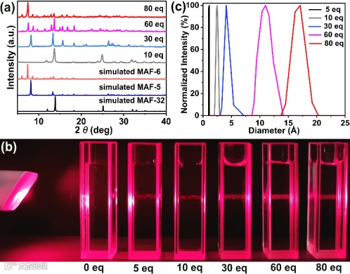 图1. (a)不同浓度HeIM形成的MAF-32, MAF-5和MAF-6的PXRD。(b)激光照射下不同浓度HeIM的丁达尔效应图。(c) DLS测定不同浓度下HeIM胶束大小。