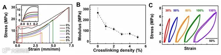 , 540),以PVDF基铁电聚合物为原料,设计卡宾交联反应以及调控高VDF铁电聚合物的结构,制备了高居里温度的弹性铁电聚合物。该研究通过设计合成了带有双吖丙啶端基的交联剂,降低了交联剂的反应能垒(图1);合成了高VDF含量且带有双键结构缺陷的P(VDF-TrFE-DB) 75/25/5 mol%铁电聚合物,在提高VDF结晶性的同时维持了退火后聚合物的拉伸性能。将交联剂和P(VDF-TrFE-DB)共混加热交联,成功制备了高居里温度(85℃)和低交联温度(150℃)的弹性铁电聚合物(图2);在3%交联密度下,具有较佳的结晶度和较软的杨氏模量(图2&3);交联后的P(VDF-TrFE-DB)具有显著的铁电性能(图4),并在50%应变下保持了稳定的铁电响应(图5)。该工作提出了一种制备弹性铁电体的新方法,提升了弹性铁电的居里温度,扩大了其潜在应用。