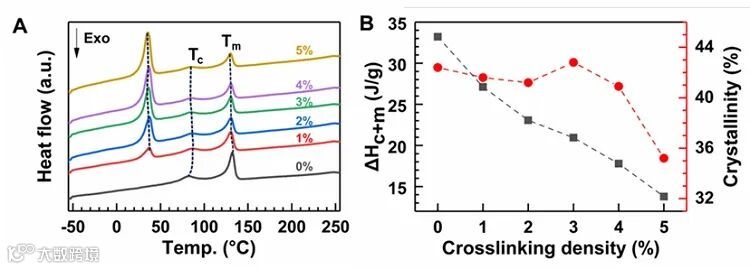 图2. 不同交联密度的P(VDF-TrFE-DB)薄膜的(A)二次升温DSC曲线、(B)热焓变化和结晶度。