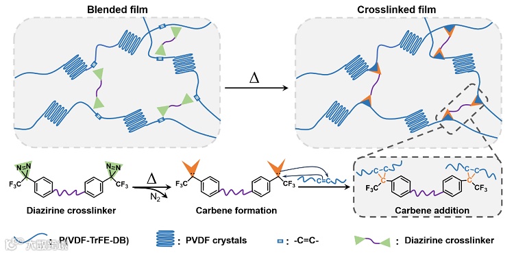图1. 通过卡宾交联制备高居里温度弹性铁电聚合物的示意图