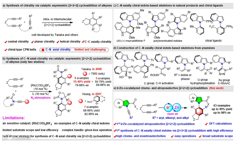 导读:温州大学化学与材料工程学院钱鹏程-李龙教授报道了首例铱/锌共催化的化学和对映选择性[2+2+2]环加成反应构建C-N轴手性吲哚和吡咯化合物