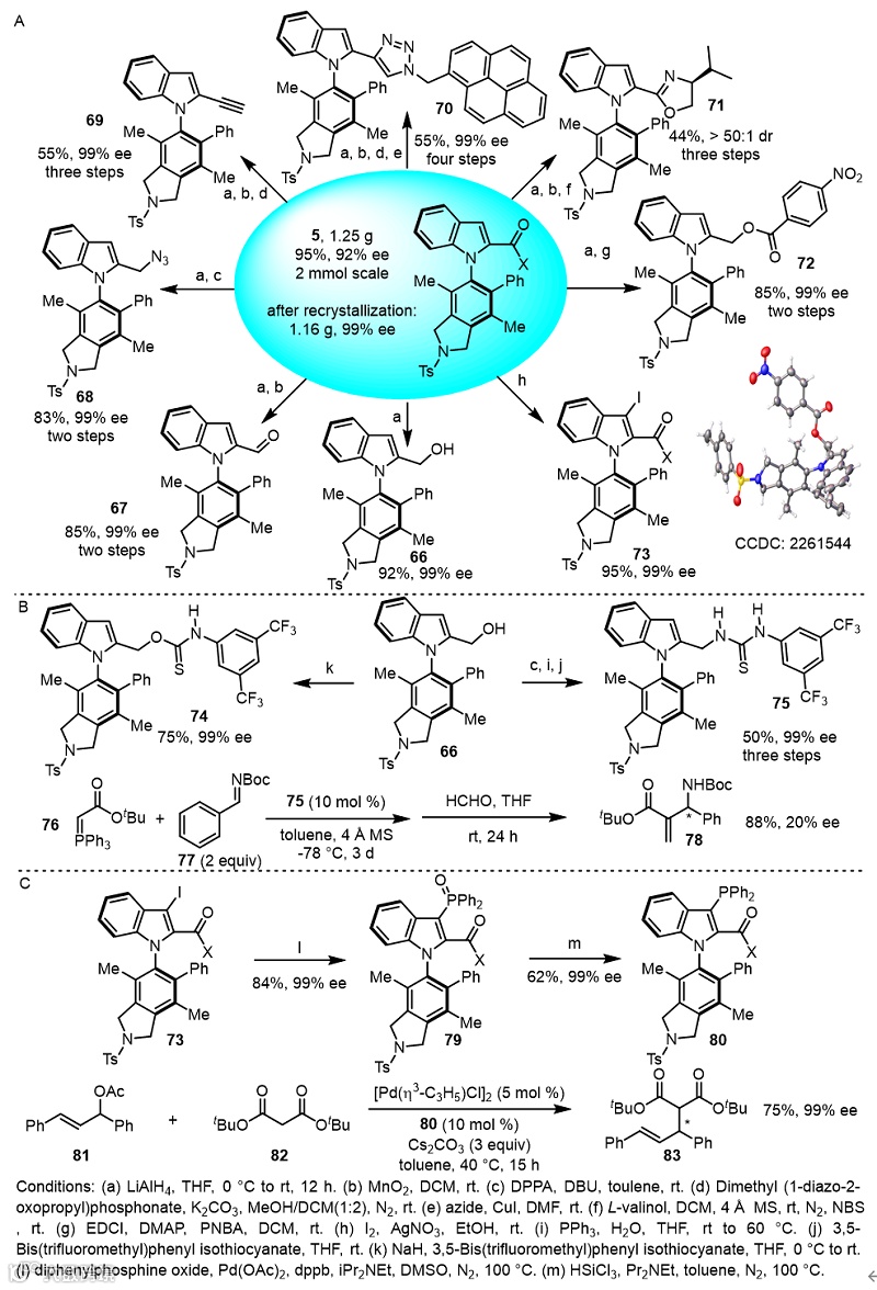 紧接着,作者模型产物进行了众多的化学转化,合成一系列不同的C-N轴手性吲哚化合物 (详见原文)。值得一提的是,模型产物经过几步简单的转化就可以合成出轴手性的硫脲催化剂和膦配体,并成功的应用与不对称反应中。特别是C-N轴手性吲哚膦配体在不对称烯丙基化反应中展示出了出色的手性调控能力(图3)。
