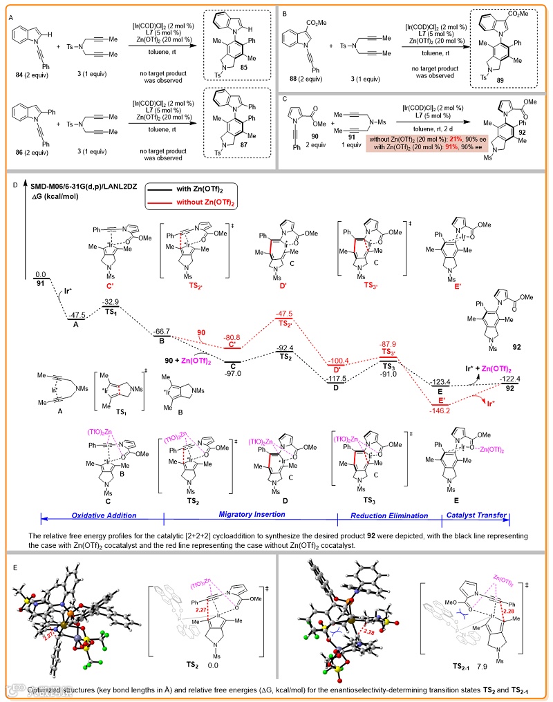 在催化不对称[2+2+2]环加成反应中的不足之处,为该类反应提供了一种全新的共催化策略。有意思的是,该工作除了表现出色的反应效率和对映选择性,也展示了专一的化学选择性。值得一提的是,通过对照实验和理论计算表明,Zn(OTf