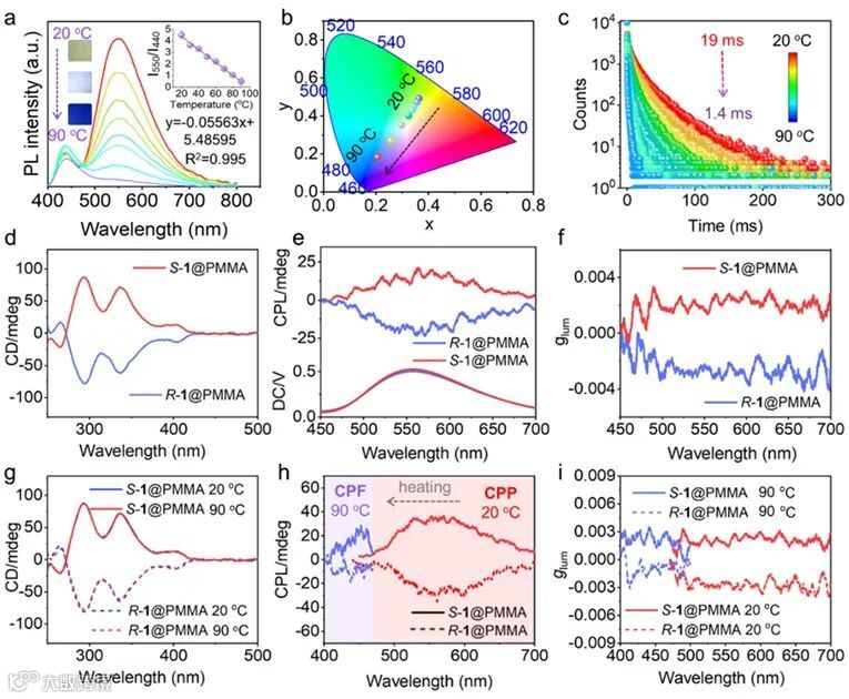 该无定形薄膜体系的发射颜色可以在光和热地刺激下,实现在黄色和蓝色之间(包括白光发射)可逆的原位调节。在调控过程中,相对稳定的荧光信号可以作为内在参考信号,可以提高整个系统发光颜色调控地相对准确度。该系统的最高光致发光量子效率在光激活后可达48% 以上。此外,该无定形单组分薄膜体系的圆偏振发光性质可以在温度地刺激下实习在圆偏振磷光和圆偏振荧光之间进行可逆切换。