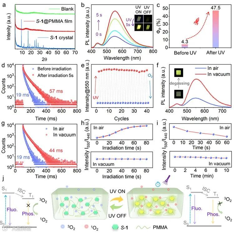 此外,通过简单地将发光团掺杂在聚合物薄膜中,制备了柔性透明的无定形薄膜体系。由于螺环多硫芳烃分子独特的分子结构,快速的系间窜越能力,合适的能隙以及刚性聚合物对三重态激子猝灭地抑制作用,所制备的无定形薄膜体系同样表现出荧光-磷光双发射性质。由于磷光对外界环境地敏感性(三重激子对氧和