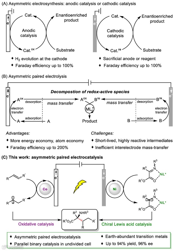不对称配对电解通过同时活化两个电极上的反应物,可以为手性分子合成提供一种更节能、经济的新策略,但是电解中产生的高活性反应中间体(如自由基和自由基离子)让对映选择性控制难以实现。因此,开发基于地球丰产元素的不对称配对电催化体系成为有机合成领域重要且颇具挑战性的课题。