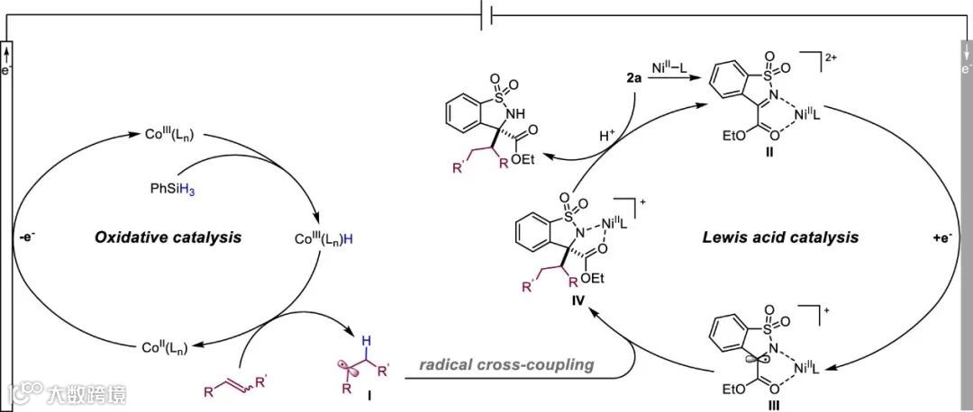 在上述结果和以往研究的基础上,作者提出一种可能的反应机理(图7)。Co(Ⅱ) 催化剂前体在阳极先发生单电子氧化形成Co(Ⅲ) 物种,它与苯基硅烷相互作用产生Co(Ⅲ)−H中间体。Co(Ⅲ)−H中间体通过氢原子转移(HAT)与烯烃反应,生成碳自由基I并再生Co(Ⅱ)。同时,磺酰亚胺与手性路易斯酸配位,在阴极上被还原形成自由基阴离子III。自由基中间体I和III的对映选择性交叉偶联可产生所需的手性胺产物,从而实现不对称烯烃−磺酰亚胺偶联反应。另一种反应途径可能是,自由基中间体I对Ni−磺酰亚胺络合物II中C=N双键加成,然后进行阴极还原,也可以提供所需的产物。