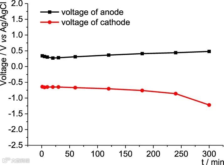 作者在标准条件下监测电解过程中的电极电压,发现阳极氧化保持在约0.3 V,而阴极还原在大部分
