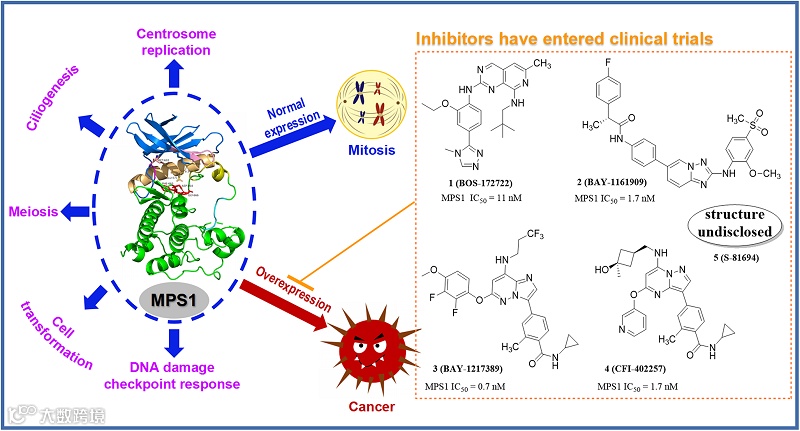 。在有丝分裂M期,纺锤体装配检查点(SAC)被激活,以确保在有丝分裂纺锤体上正确排列姐妹染色单体,并确保它们随后平等地分离到子细胞中。MPS1在有丝分裂中发挥关键角色,作为一种双特异性激酶,负责主导纺锤体装配检查点的激活以及姐妹染色单体的分离。目前MPS1被发现在多种人类恶性肿瘤中的过度表达,例如胶质母细胞瘤、胰腺导管腺癌、肝癌、肺癌和乳腺癌。高表达的MPS1通过降低纺锤体装配检查点的敏感性,允许高度异倍体的肿瘤细胞完成有丝分裂并存活。因此,MPS1被认为是癌症治疗中一个具有希望的靶点。