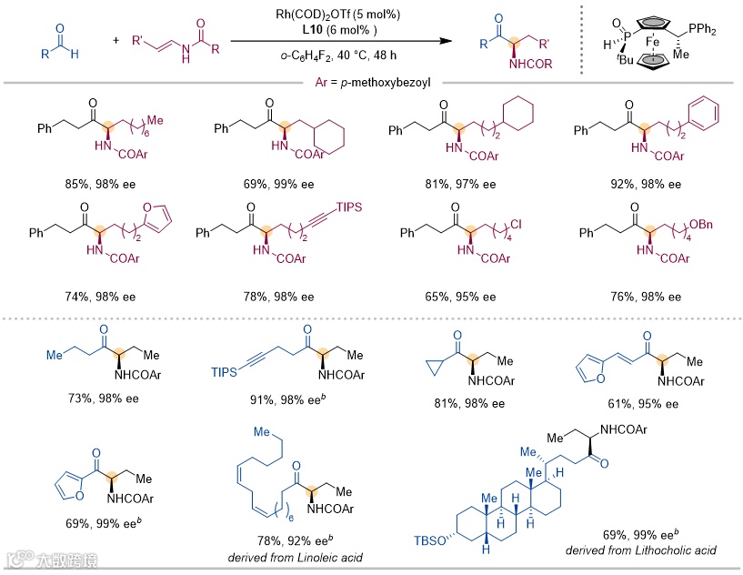 -不饱和酰胺的不对称氢酰基化反应。该反应同样具有较好的底物兼容性,带有不同官能团的