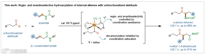 导读:近日,清华大学李必杰课题组使用配位辅助策略(Acc. Chem. Res. 2023, 56, 308),有效抑制了非官能团化醛的脱羰过程,实现了铑催化的非官能化醛与内烯烃的区域及对映选择性氢酰基化反