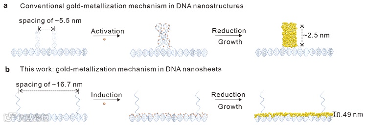 )优先吸附在DNS表面,而非突出的单链DNA(single strand DNA,ssDNA)上,从而在DNS表面形成平滑的金纳米片。这一过程与先前报道的金属纳米颗粒/簇沿着DNA纳米结构上突出的DNA生长完全不同,更重要的是,金纳米片形成后保留了DNA纳米结构的空间可寻址特征,这为未来拓展其应用提供了更多可能性。