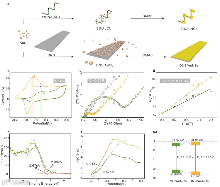 进一步地,作者将DNS/AuNSs作为葡萄糖氧化反应的电催化剂研究了其电催化性能。由于其更大的电化学活性面积和更宽的带隙,这些金纳米片展现出比离散金纳米簇更高(约3倍)的电催化活性。鉴于这一优势,该框架核酸模板化的AuNSs有望用于设计新型电化学DNA生物传感器,促进生物分子检测领域的发展,为其在催化和新能源材料等广泛领域提供了应用前景。