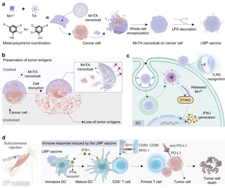 由金属多酚纳米涂层包裹肿瘤细胞的策略,并进一步用细菌脂多糖(LPS)进行表面修饰作为疫苗佐剂,构建了全细胞疫苗,称为LMP vaccine
