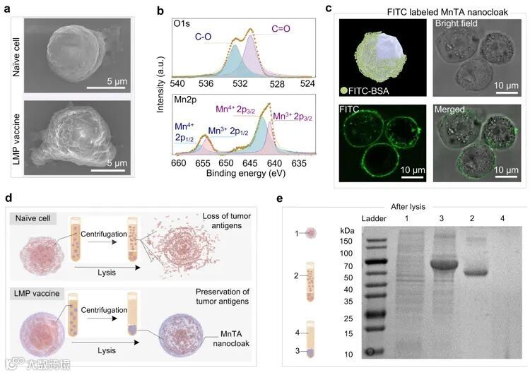 在这项研究中,该团队首先在肿瘤细胞(B16F10细胞)表面基于非共价键形成单宁酸和锰离子组成的纳米涂层,进一步用LPS进行表面修饰后,制备了LMP vaccine。与原始肿瘤细胞相比,LMP vaccine表面粗糙度增加但保持了完整的细胞结构(图2a-c)。单宁酸与生物分子(蛋白质、核酸等)的多种相互作用力使得形成的纳米涂层可以粘附肿瘤相关抗原,避免了被包裹的肿瘤细胞在受到破坏时肿瘤抗原的流失(图2d-e),使LMP vaccine中包含全部的肿瘤相关抗原信息。