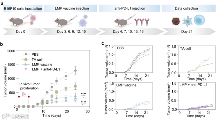 最后,该研究通过黑色素肿瘤模型小鼠验证了LMP vaccine的肿瘤抑制效果(图4a)。结果显示,LMP vaccine可以抑制原发性肿瘤的生长和转移(图4b-c)。通过使小鼠体内的树突状细胞成熟比例增加,从而进一步激活肿瘤特异性T细胞来抑制肿瘤生长。LMP vaccine的这一肿瘤免疫抑制效果促进了其在与免疫检查点阻断疗法(anti-PD-L1)联合后,在小鼠模型显示了协同的肿瘤抑制效果。